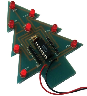 Jedno integrisano kolo, jedan kondenzator, jedna baterija, dva otpornika, dve otpornièke mreže, osam LE dioda, na jednoj štampanoj pločici koja ima oblik jelke, čine ovaj interesantan komplet delova.