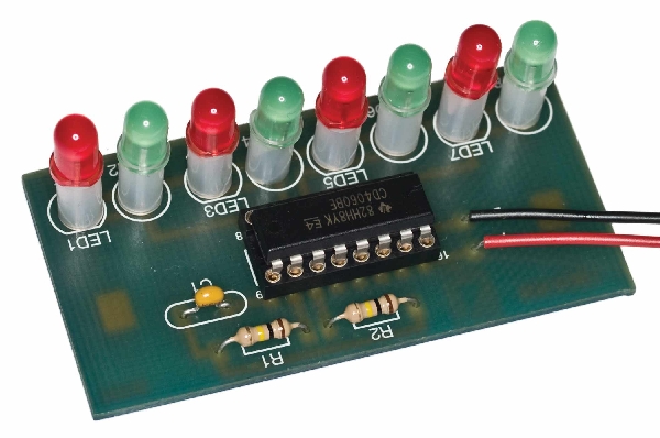 Ovaj bedž je jednostavna, a veoma atraktivna gradnja. Sadrži jedno integrisano kolo, osam LE dioda u dve boje, dva otpornika i jedan kondenzator. Sve to je smešteno na maloj štampanoj pločici dimenzija 63 X 32 milimetra